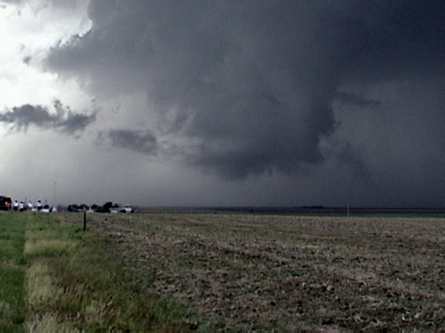 A LONG, wild chasing day! We spent a lot of the early part of the day at the truck stop in North Platte amongst a bunch of other chasers. Eventually we decided to go after a cell south of Chappell, Nebraska. We saw a big, long lived stovepipe tornado (30+ minutes on my tape) that was luckily just north of the town. The tornado was fantastic: It initially formed on the outer edge of the mesocyclone just south of Chappell as a needle funnel with a persistent debris cloud and started rotating counterclockwise along the outside edge. After about 5 minutes the debris cloud disappeared but the funnel persisted and as it rotated to the northeast section of the mesocyclone it touched down again. As the tornado rotated around the back side of the meso (relative to our position east of Chappell) it appeared to move right to left in the opposite direction of the storm motion, and then disappeared behind the wall cloud. The wall cloud then became caught up in the tornadic rotation and produced a very large stovepipe tornado at its base. The video is awesome with the whole storm base rotating violently and a large tail cloud being pulled in and wrapped into the wall cloud. It was on the ground in this form for another 10 minutes before becoming a stout cone tornado and then entered the rope-out phase. After the rope phase of the tornado got rained wrapped we proceeded after the still large, rotating block shaped wall cloud.