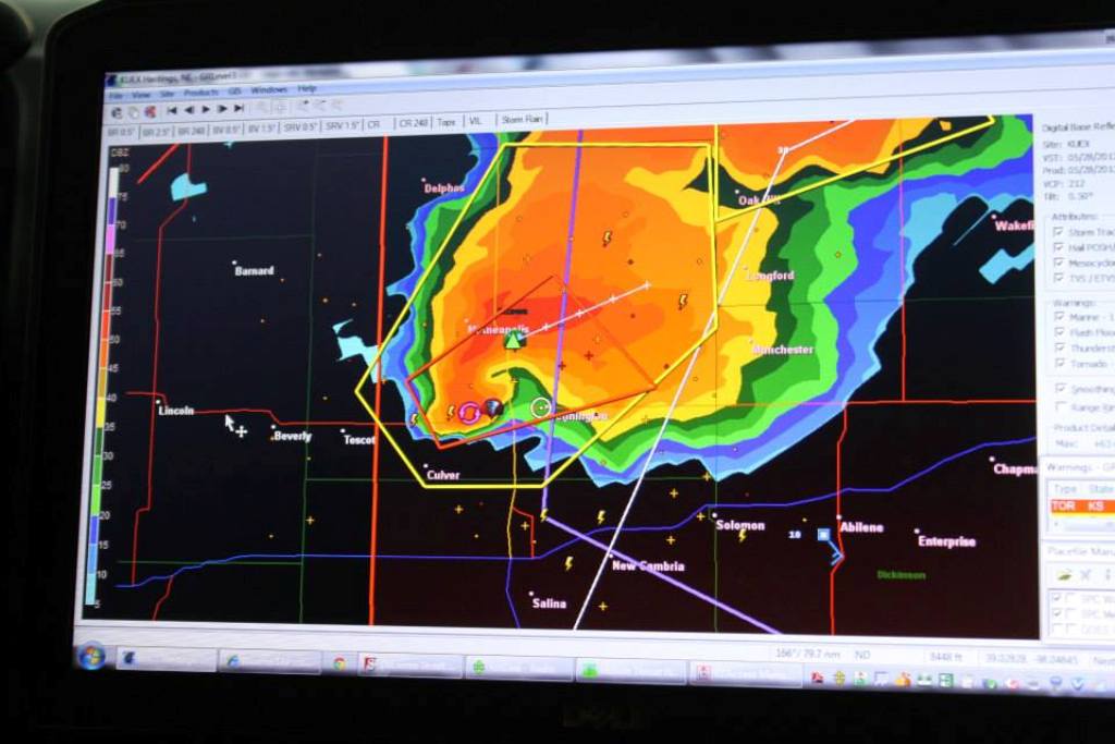 A great chase day and the shortest I’ve ever driven for a chase! The toughest part of this day was figuring out our target. We started the day in Salina, KS sleeping in a little and waking to discover that we had 3 distinct targets to consider: Northeast Kansas just east of where we were along the boundary with a good combination of shear and moisture, a nice high plains setup in Northeast Colorado, or the southwest part of the boundary near Dodge City, KS. We agonized for a bit and told the guests we’d meet an hour later, then decided that at least we would not take the Cheyenne Ridge bait and hedge more about where on the boundary to play, so we waited, then went to lunch, hung out at Walmart, then parked at the Petro on the north side of town and waited some more, as by now we’d decided to play the northeast target. Problem was, it looked like we’d waited too long with a cell already dropping a tornado in the Manhattan, KS area, 100 miles east of us and out of range! We calmed down and reasoned however that if we could get a cell to develop and right turn into the same environment the Manhattan storm developed in, it might do the same thing.
