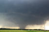 We continued to wait as towers bubbled all around us and more and more chasers parked at the same gas station with us, until finally an updraft just to our west took off and we headed out north on old Highway 81 after it. The storm was not moving fast at all, and we were easily able to get east of it, parking just off Rt. 18 west of Bennington. As we watched, the storm, which was really a group of updrafts, began to congeal into one supercell and showed immediate signs of rotation, much as the Manhattan storm had. We kept our fingers crossed as a cell to the south merged with it, and storm survived and was soon a rotating monster! The rotation under the mesocyclone continued to increase until, 35 minutes after we initially parked, a long elephant trunk funnel formed, making it 2/3 of the way to the ground (there were some reports of a brief touchdown but we were not in a position where we could see it) before dissipating a minute or two later with a neat ropeout. By now, the wall cloud was spinning like crazy and it was only a matter of time before it tornadoed, and 15 minutes later the storm dropped a big cone about 3 miles west of us and slowly coming directly at us. We then watched as the huge cone lasted for almost an hour, barely moving at all. As it got closer you could get a good feel for the motion of the tornado, and soon Bennington was sounding their tornado sirens. As the tornado closed on us, it occasionally got wrapped in rain, peaking in and out as the rain curtains wrapped around. Soon the tornado turned into a monster half-mile wide wedge, sort of reminding me of the Quinter tornado of 2008. What a moose! The structure and motion of the storm was incredible, with a striated updraft and inflow bands streaming in from all directions and wrapping around the updraft.